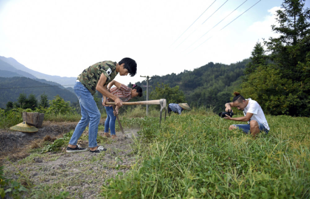 為了上網(wǎng)推介、售賣(mài)家鄉(xiāng)特產(chǎn),安化縣一塊花生地里正錄制視頻 李尕 攝