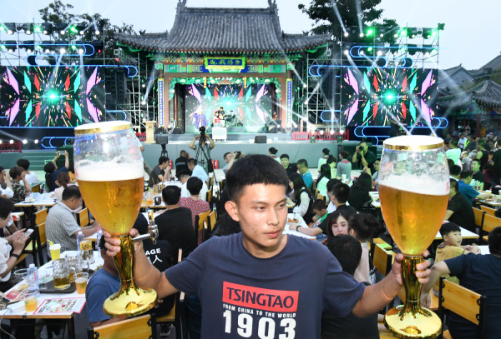 一名男士在青島國際啤酒節(jié)即墨古城會場舉起啤酒杯慶祝 李紫恒 攝