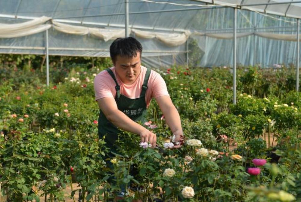 在沭陽縣新河鎮(zhèn)新槐村,年輕的花農(nóng)在大棚內(nèi)給月季花修剪花枝 任鵬飛 攝