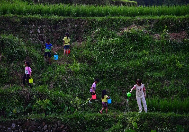 在桂黔烏英苗寨,大學生潘木枝(右一)帶著小學生給樹苗澆水 黃孝邦 / 攝
